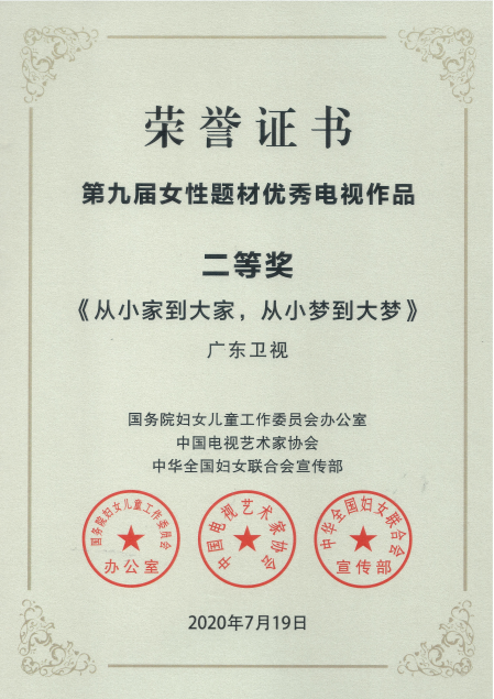日前,官金仙董事长个人纪录片《从小家到大家 从小梦到大梦》荣获第九届女性题材优秀电视作品二等奖,该奖项由国务院妇女儿童工作委员会办公室、全国妇联宣传部、中国电视艺术家协会联合颁发